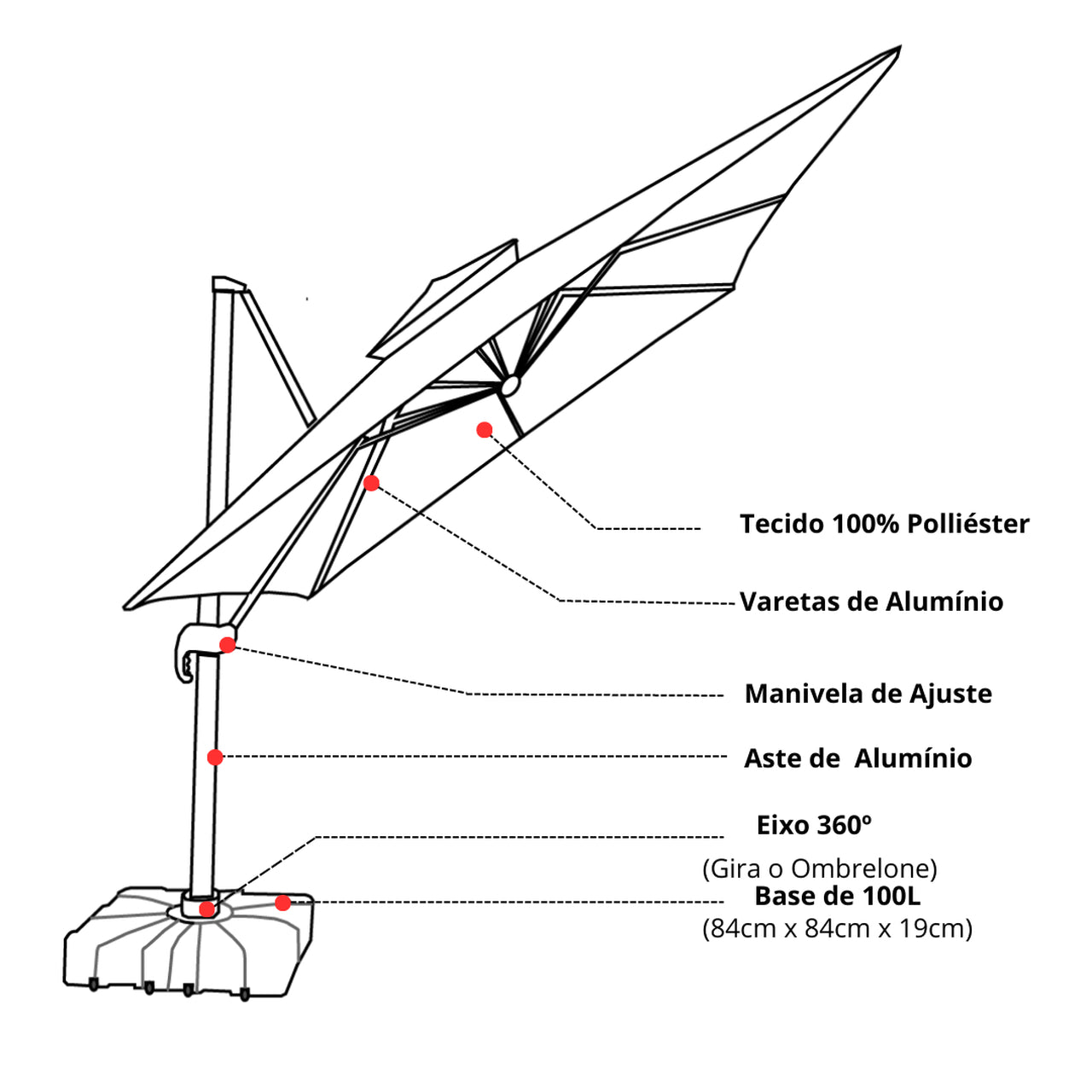 A Base não está inclusa neste produto. Para garantir a estabilidade e segurança do Ombrelone, é obrigatório o uso de uma base pesada. Recomendamos a aquisição de bases com capacidade mínima de 70 a 80 litros ou o uso de bases de concreto/pedra adequadas.