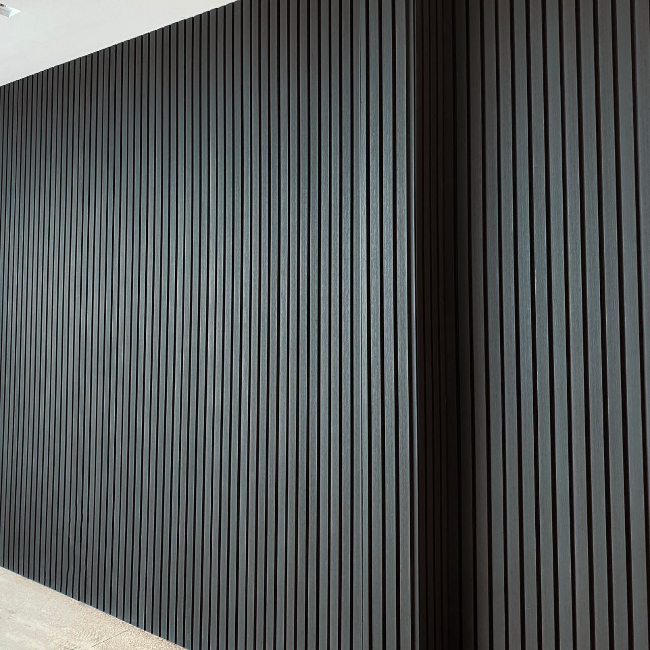 O painel possui acabamento ripado que simula a textura da madeira, agregando **sofisticação** e valor ao espaço.